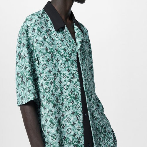 【服装】衣服/LV/路易威登 24新款 男士雾蓝色棉混纺绉纱老花图案衬衫1ABJBD